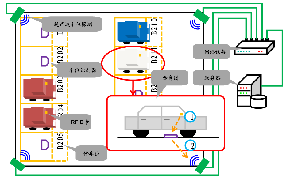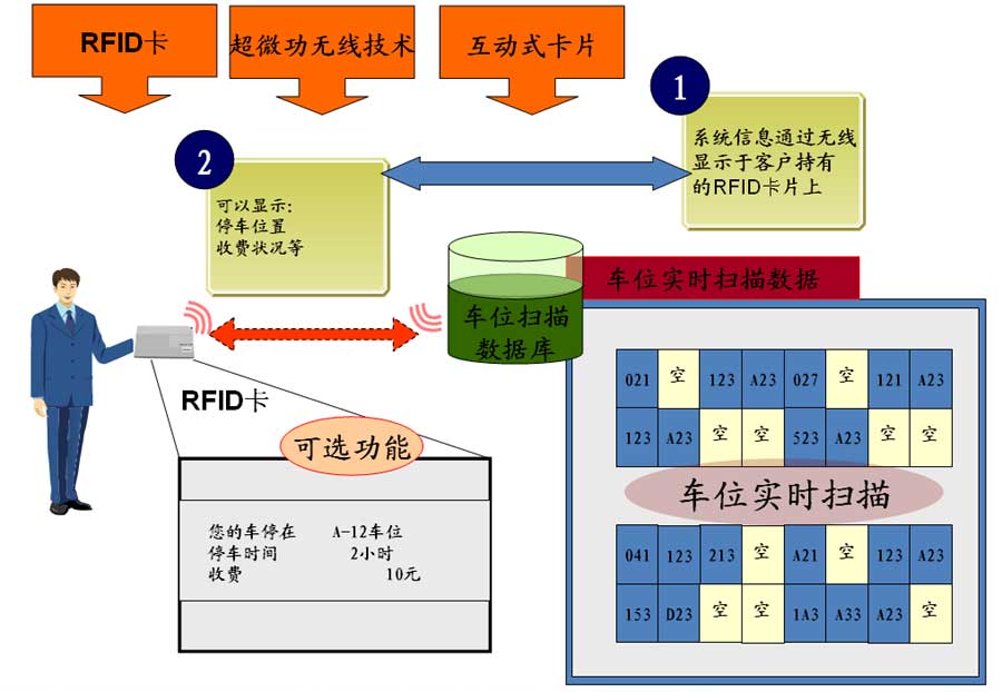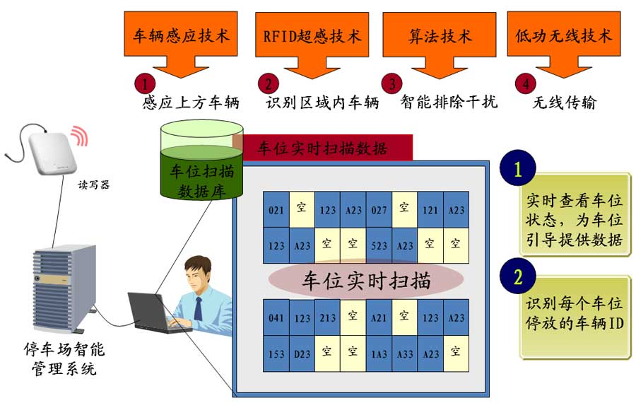 精確尋車技術(shù)是基于RFID無(wú)線識(shí)別技術(shù)的一種應(yīng)用。當(dāng)車輛停入車位時(shí),安裝在每個(gè)車位上的“車位識(shí)別器”會(huì)獲取到車輛信息;然后“車位識(shí)別器”會(huì)將車位信息發(fā)送,這樣我們可以準(zhǔn)確的知道車位狀況。