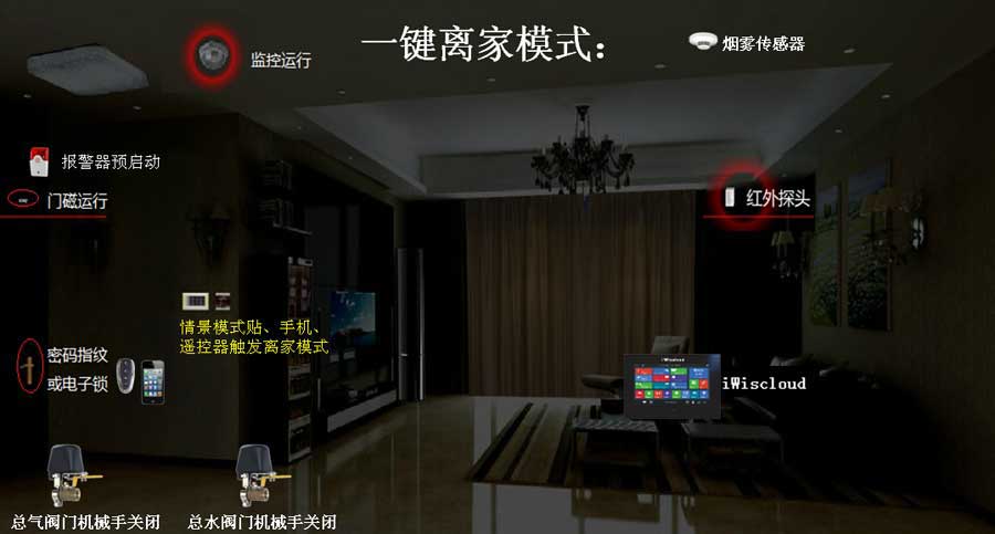 通過4鍵遙控器或門口的隨意貼按下“離家模式”,窗簾緩緩關閉,室內所有用電器斷電、斷水、斷氣,門磁、窗磁、移動物體傳感器、煙霧報警器等全部啟用布防。